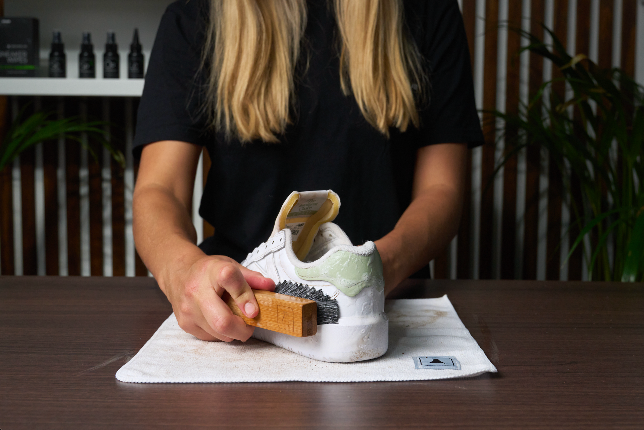 Step 2: Next, apply our Sneaker Cleaner solution over the entire surface of the sneakers. Dip our Premium Brush into a container of water and begin scrubbing the mesh upper in a circular motion until a foamy lather forms. Proceed to clean the outsole of the sneaker, ensuring to scrub until all dirt is lifted from the surface.