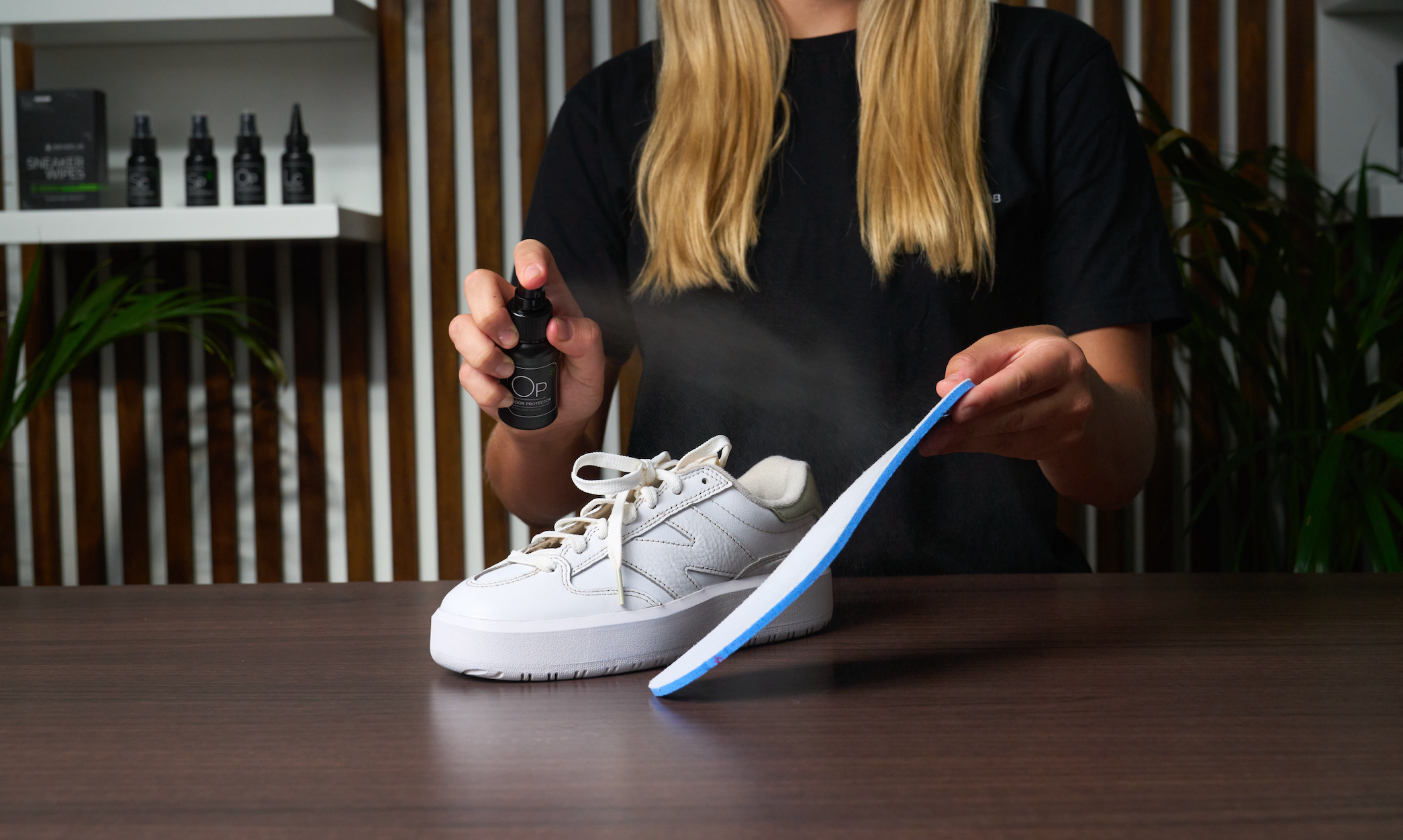 Step 6: Apply our Odor Protector within the soles of your CT302s to effectively eliminate unpleasant odors and hinder the growth of bacteria. Take out the insoles and generously spray both the interior of the sneaker and the insoles themselves.