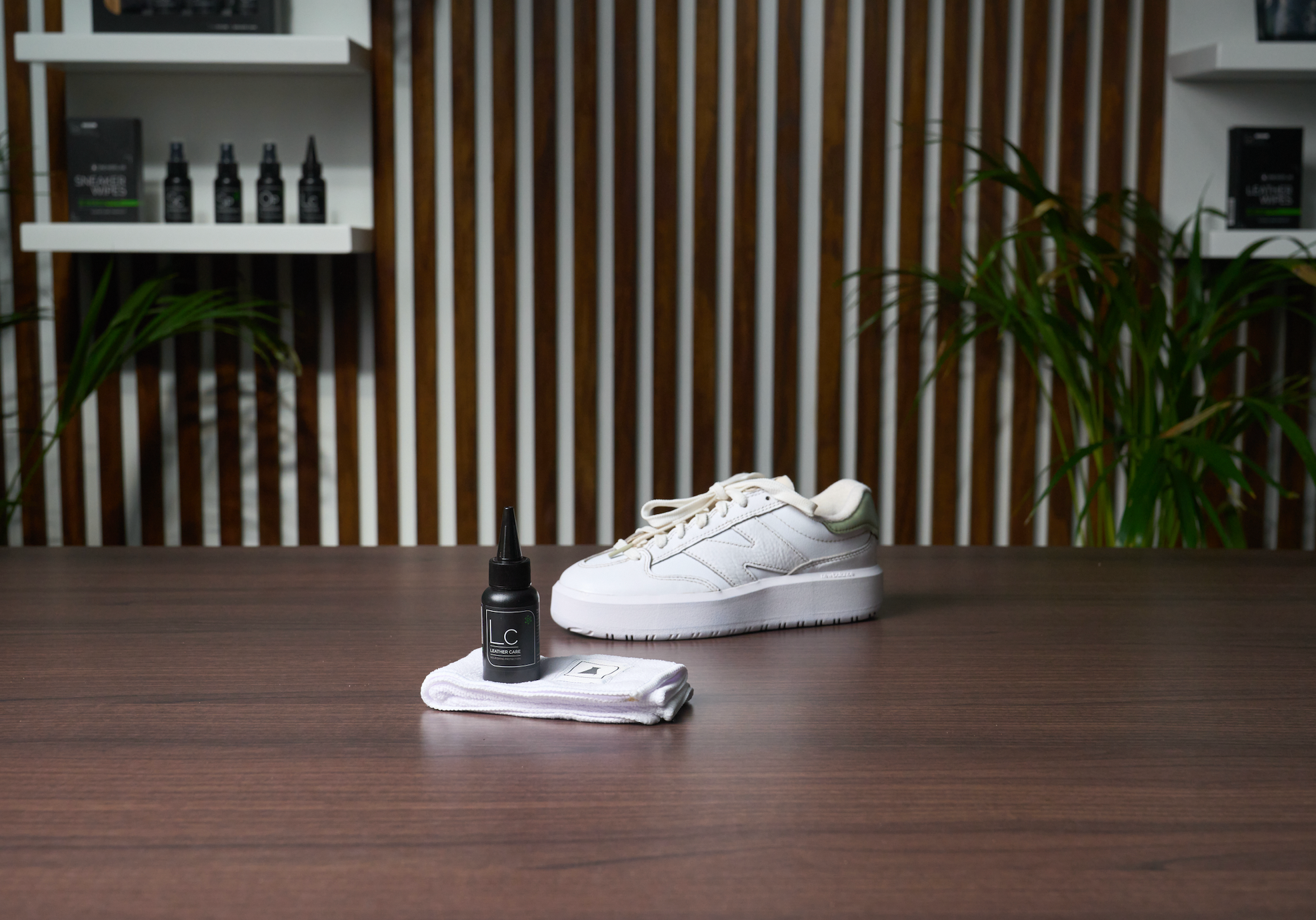 Step 8: Complete the cleaning process by applying our Leather Care solution to the leather outsole using a clean Microfiber towel. This treatment nourishes and safeguards, resulting in a fresh and polished appearance. Additionally, the conditioner shields your New Balances from harmful UV rays and establishes a water-resistant barrier for added protection.