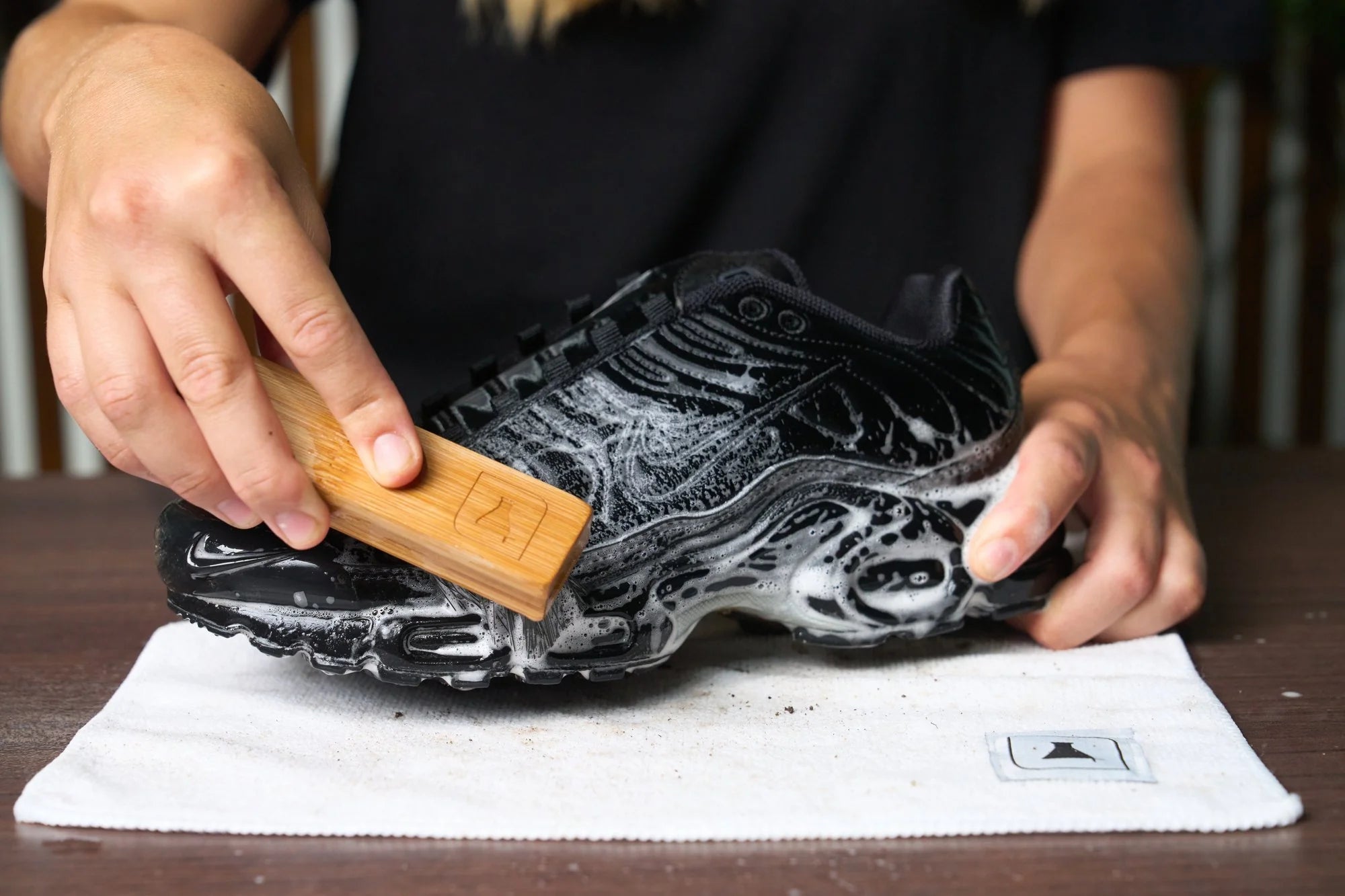 Step 2: Next, evenly apply our Sneaker Cleaner solution over the entire surface of the sneakers. Dip our Premium Brush into a container of water and begin scrubbing the synthetic upper in a circular motion until a foamy lather forms. Proceed to clean the rubber outsole of the sneaker, ensuring to scrub until all dirt is lifted from the surface.