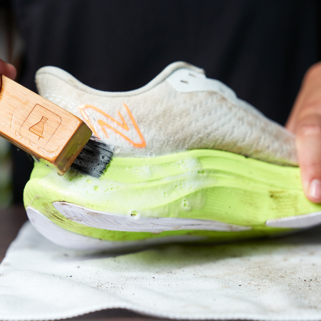 Step 2: Next, evenly apply our Sneaker Cleaner solution over the surface of the shoes. Submerge our Premium Brush into a container of water and begin scrubbing the mesh upper in a circular motion until a foamy lather forms. Proceed to clean the outsole of the shoes, ensuring to scrub until all dirt is lifted from the surface.