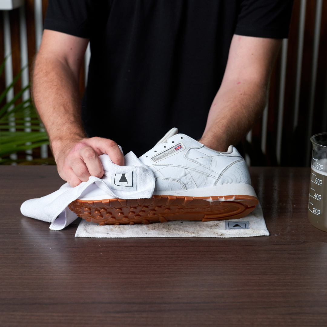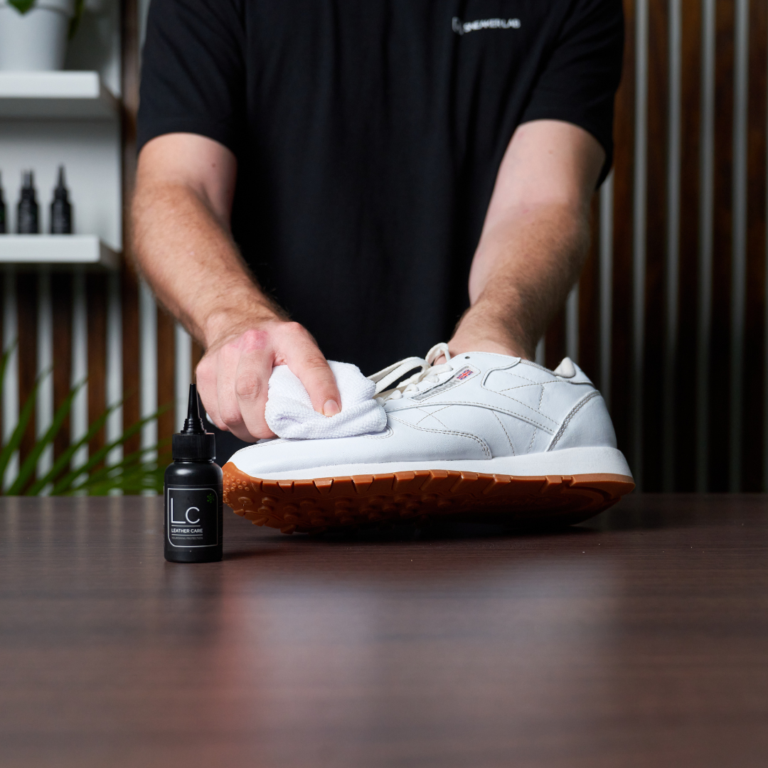 Step 8: Complete the cleaning process by applying our Leather Care solution to the leather outsole using a clean Microfiber towel. This treatment nourishes and safeguards, resulting in a fresh and polished appearance. Additionally, the conditioner shields your Reeboks from harmful UV rays and establishes a water-resistant barrier for added protection.
